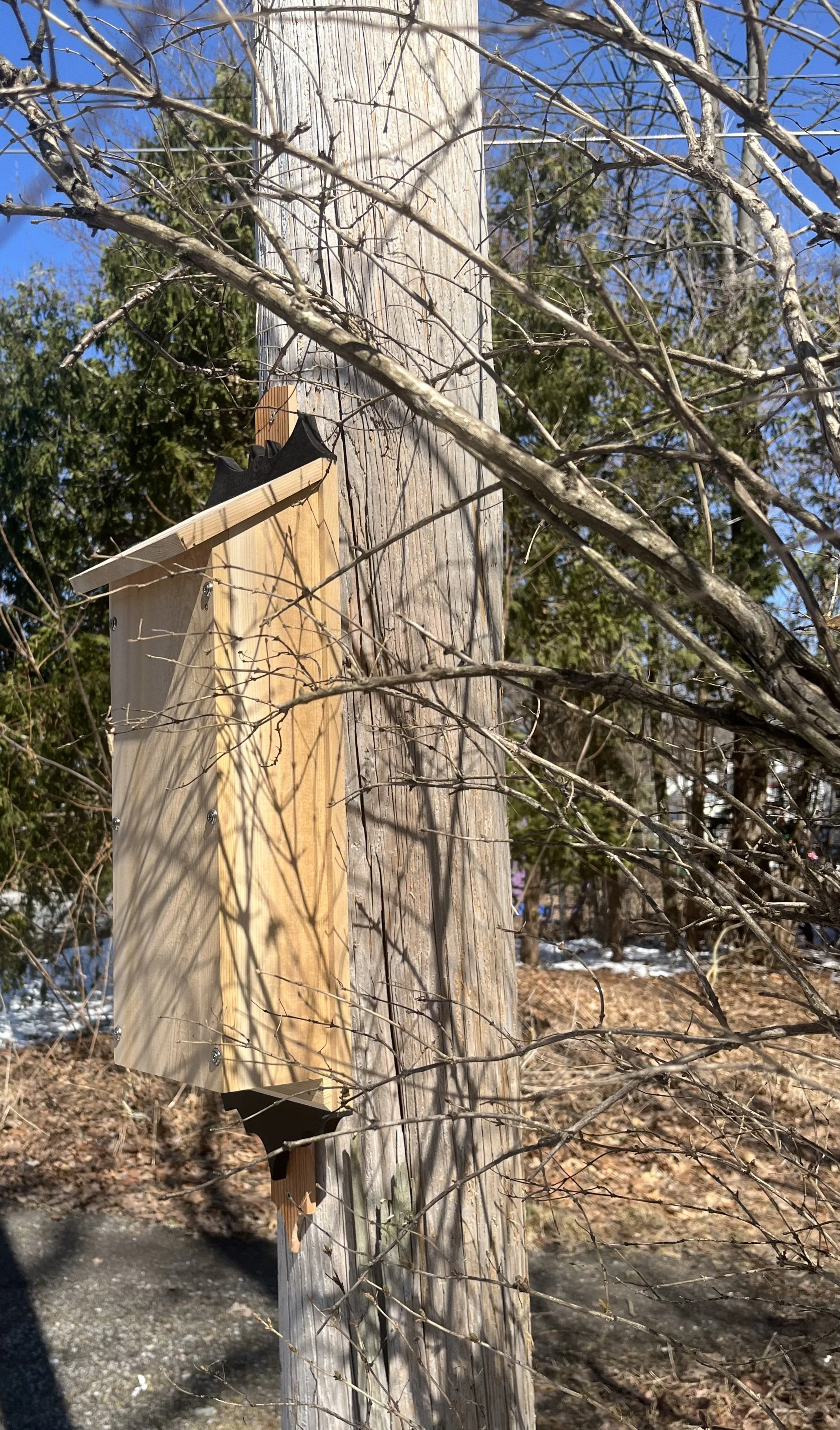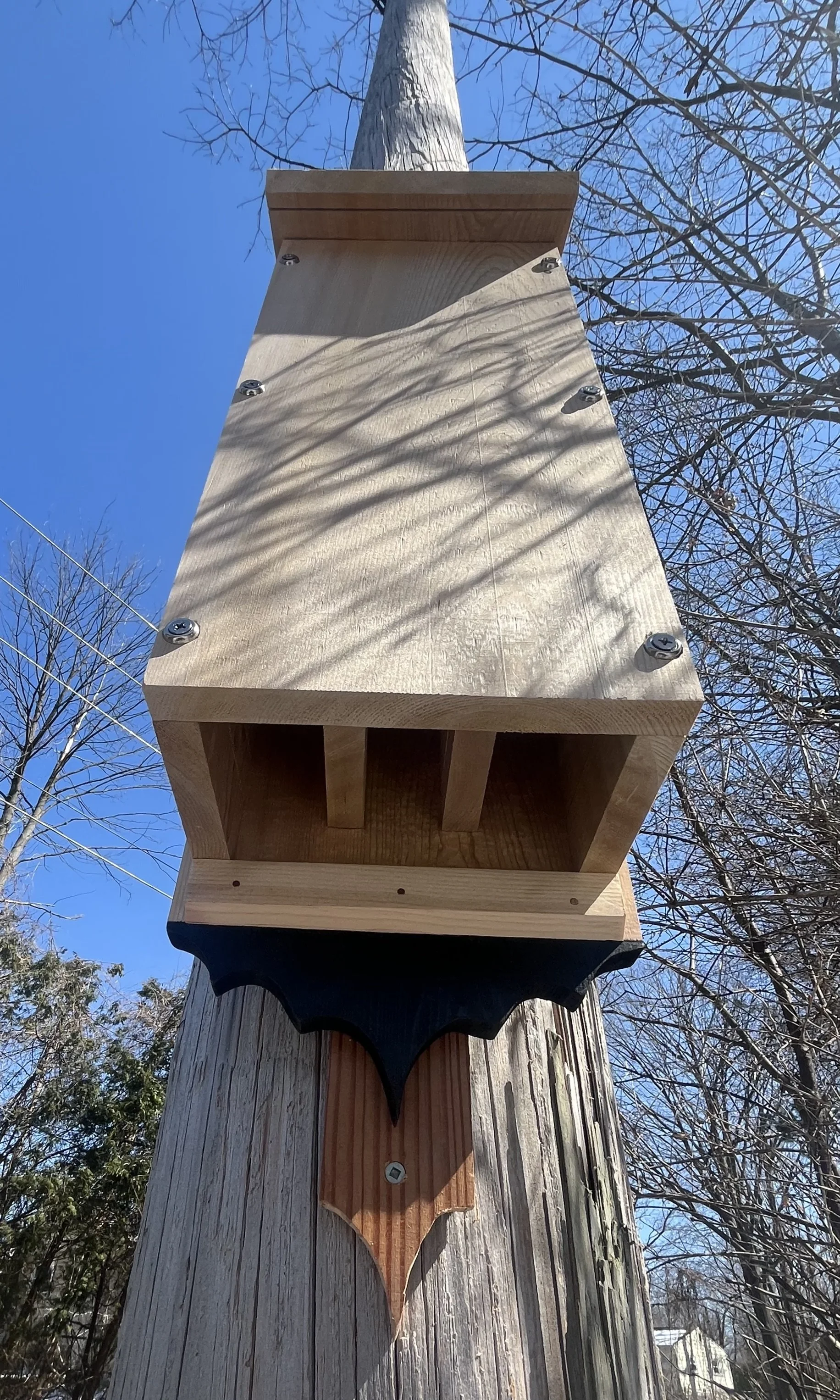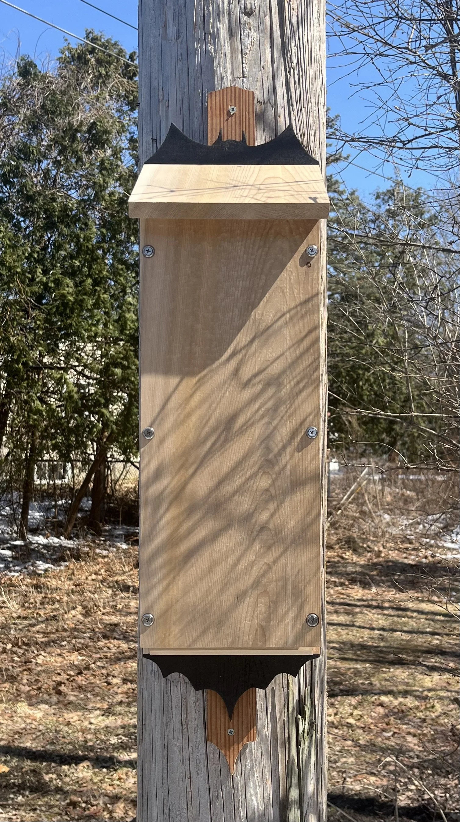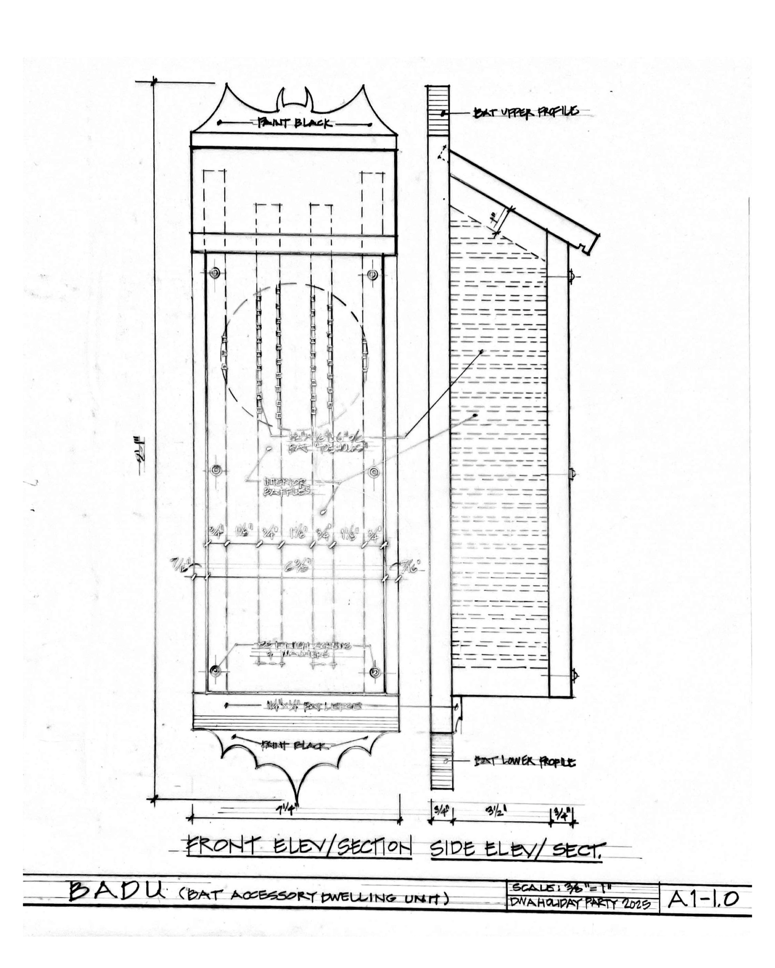 Every holiday season, the team at DWA does a “Yankee Swap” gift exchange. Each year is a different theme, and the gifts are exchanged at a different local venue every year. The 2025 event was held at the Onion City Chicken and Oyster Restaurant, and the theme was “Pearls, Plans, and Oysters”, which left open lots of options. Hand-crafted gifts are always encouraged, and consistent with the DWA environmental ethos, one of the gifts was a hand-crafted bathouse - the connection to the “plans” theme was its custom design, and part of the gift was the drawing. Bats need tight spaces where they can roost very densely. The tight spaces and high volume of bats keep the bathouse warm. In order to facilitate entering the bathouse, they need a ledge to grab onto, and within the house, the walls need to be grooved (see interior photos) so they can use the grooves to climb up. The interior partitions are shorter to allow for through ventilation from bottom to top. The front face is removable for future cleaning, which would need to be done with respiratory and skin protection. The infamous bat logo is expressed at the top and bottom of the back board, and it can conveniently mounted using its mounting bracket.