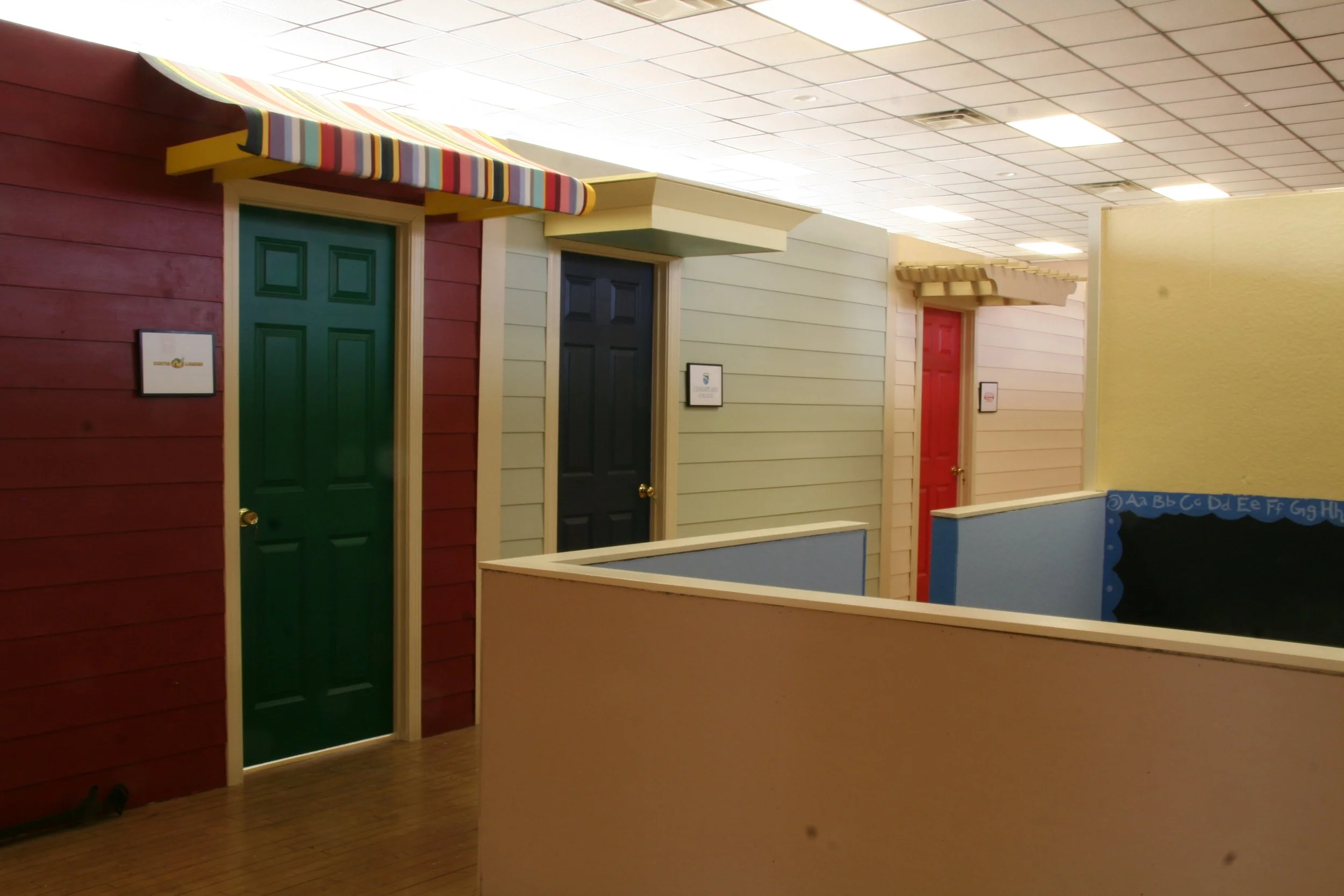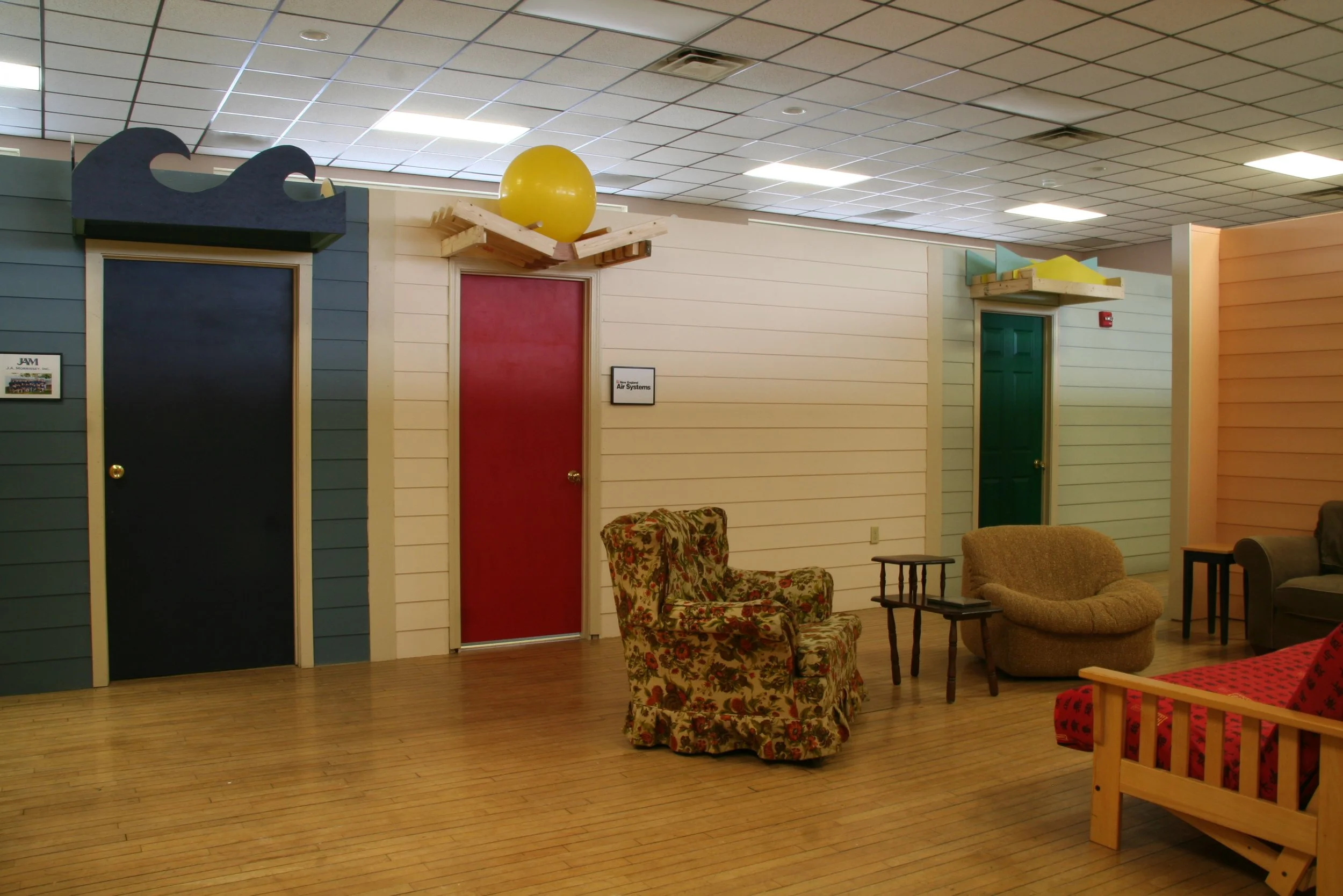 When the local Eagles Club vacated its downtown location, the new owner of the building allowed it to be used to address what was then (and remains today!) a crisis in unhoused families and single folks. Rita Markley, then ED of COTS (Committee On Temporary Shelter), convened a meeting with Bob Duncan of DWA and Jeanne Morrissey of JAM, Inc. to review the building and press forward on an all-volunteer project to create emergency shelter space before winter’s end. The second floor included a kitchen area, large ballroom, and ancillary spaces such as storage and bathrooms; the first floor was composed of smaller spaces (the Club’s former bar, billiards room, etc.), so the second floor was designated for families and the first for singles. The ballroom was divided into 12x12 rooms around a central “piazza” space and some smaller study and work spaces. Rooms did not have enclosed ceilings, so as to better utilize mechanical and ventilation systems, knowing this use would be temporary. JAM, Inc. donated supervisory and carpentry work, along with nearly all of the materials. Each room had a canopy at its entrance, each of them different and designed by staff of DWA and other Burlington architects. Facades of the rooms were finished with typical exterior materials to create a village streetscape. Many community members joined in to build, paint and finish the spaces, and JAM, Inc. was able to solicit many other local businesses to contribute as well. The building served this purpose until it was removed in favor of a new block-long building of commercial space with student housing above.
