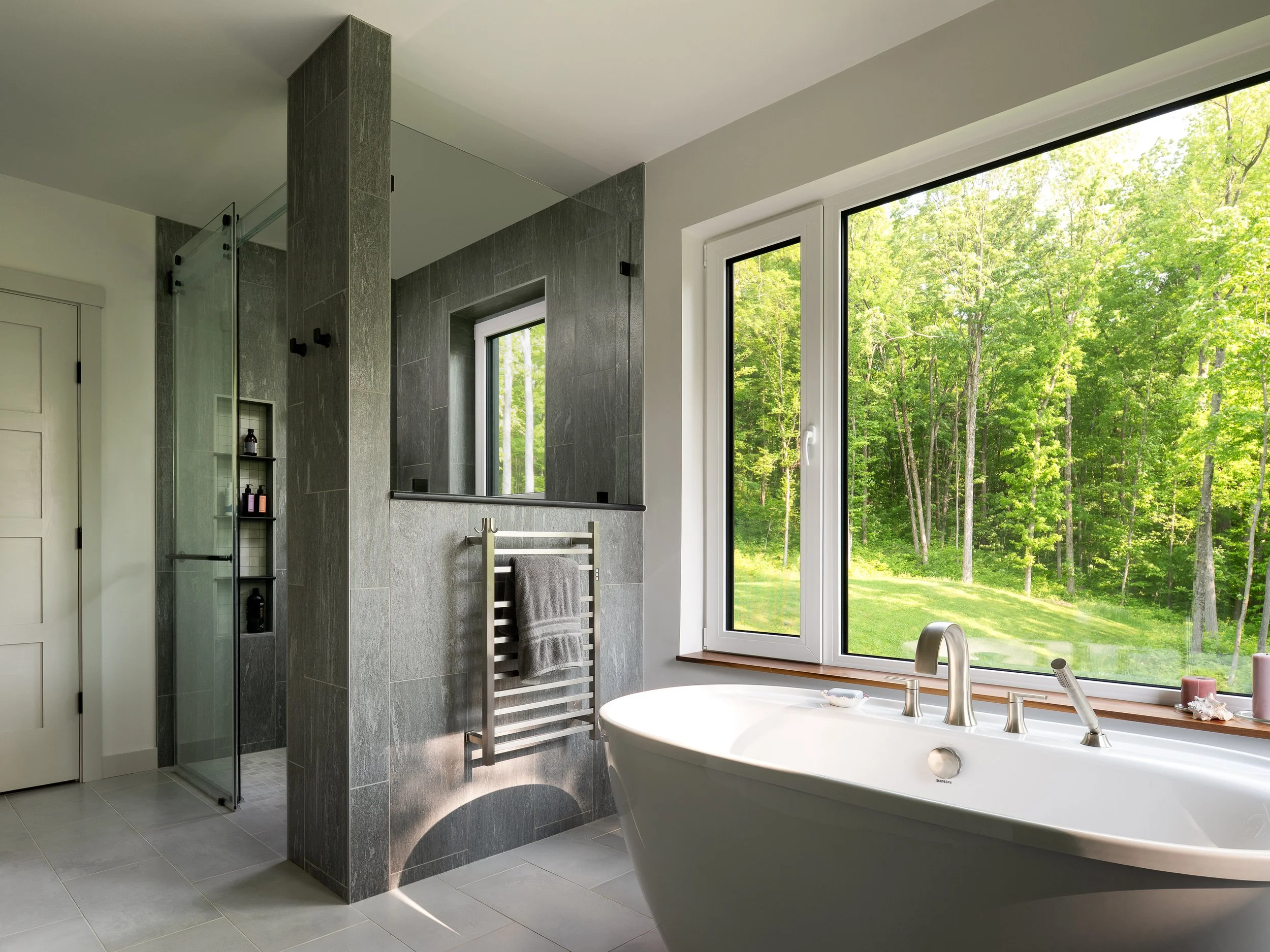 A retired couple for whom DWA had completed several commercial projects decided to build a custom home in Middlebury, VT, uniting the team of architect and builder (JAM, Inc.) who had completed the commercial projects. The 16 acre parcel is close to the village, with seasonal views to the east and ample solar exposure to create a net-zero home. Organized perpendicularly to its gently sloping site, the long axis of the house receives maximum sun, while the change in topography permits the lower level to be used for guest bedrooms and a large exercise space, directly accessing the hot tub and local walking trails. The main floor includes an open plan kitchen/living/dining space connected to two exterior porches and a screened porch; a master bedroom/bath/closet wing; a separated TV/lounge space, and other ancillary uses such as laundry, pantry, etc. Avid pet owners, the mudroom entry includes a tiled dog wash station. The house is all-electric, built to near Passive House standards of insulation, air sealing (.08 CFM/SF), and ventilation with triple glazed windows and doors, with full solar PV complement.